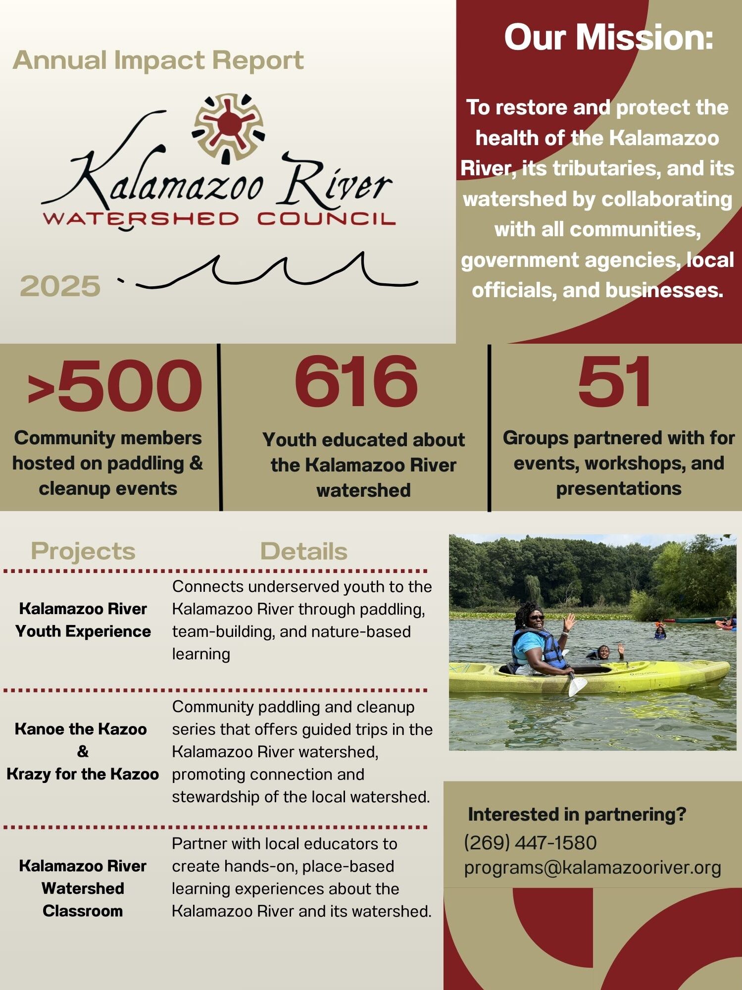 The Kalamazoo River Watershed Council’s mission and vision come from a desire to protect, preserve, and promote the Kalamazoo River and its tributaries for all area residents and visitors, and future generations.